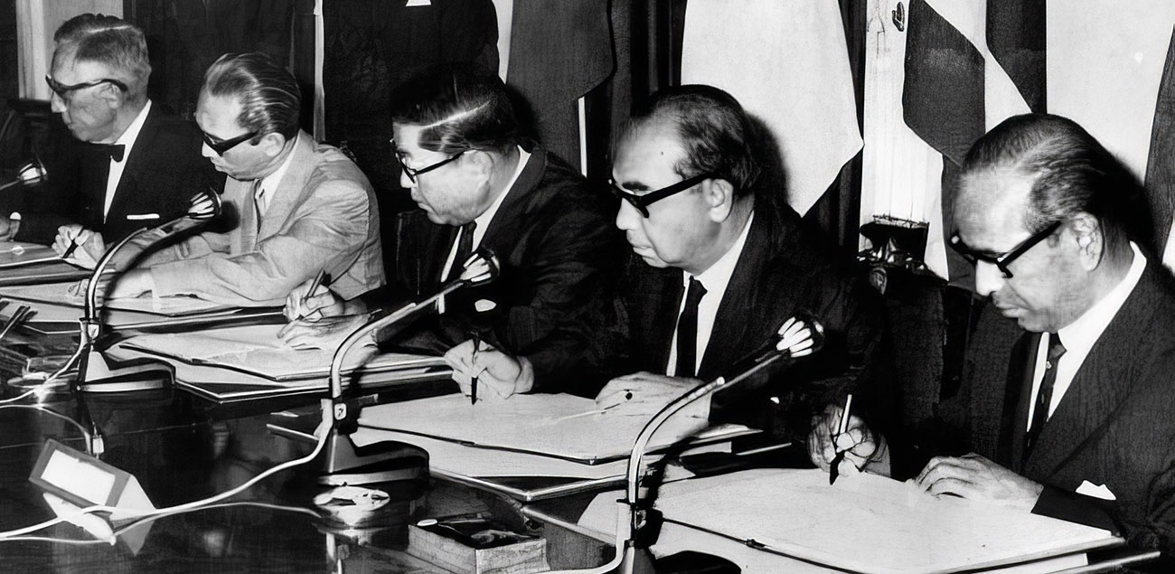 The signing of the ASEAN Declaration in Bangkok on 8 August 1967 by five foreign ministers, marking the establishment of the Association of Southeast Asian Nations (ASEAN)