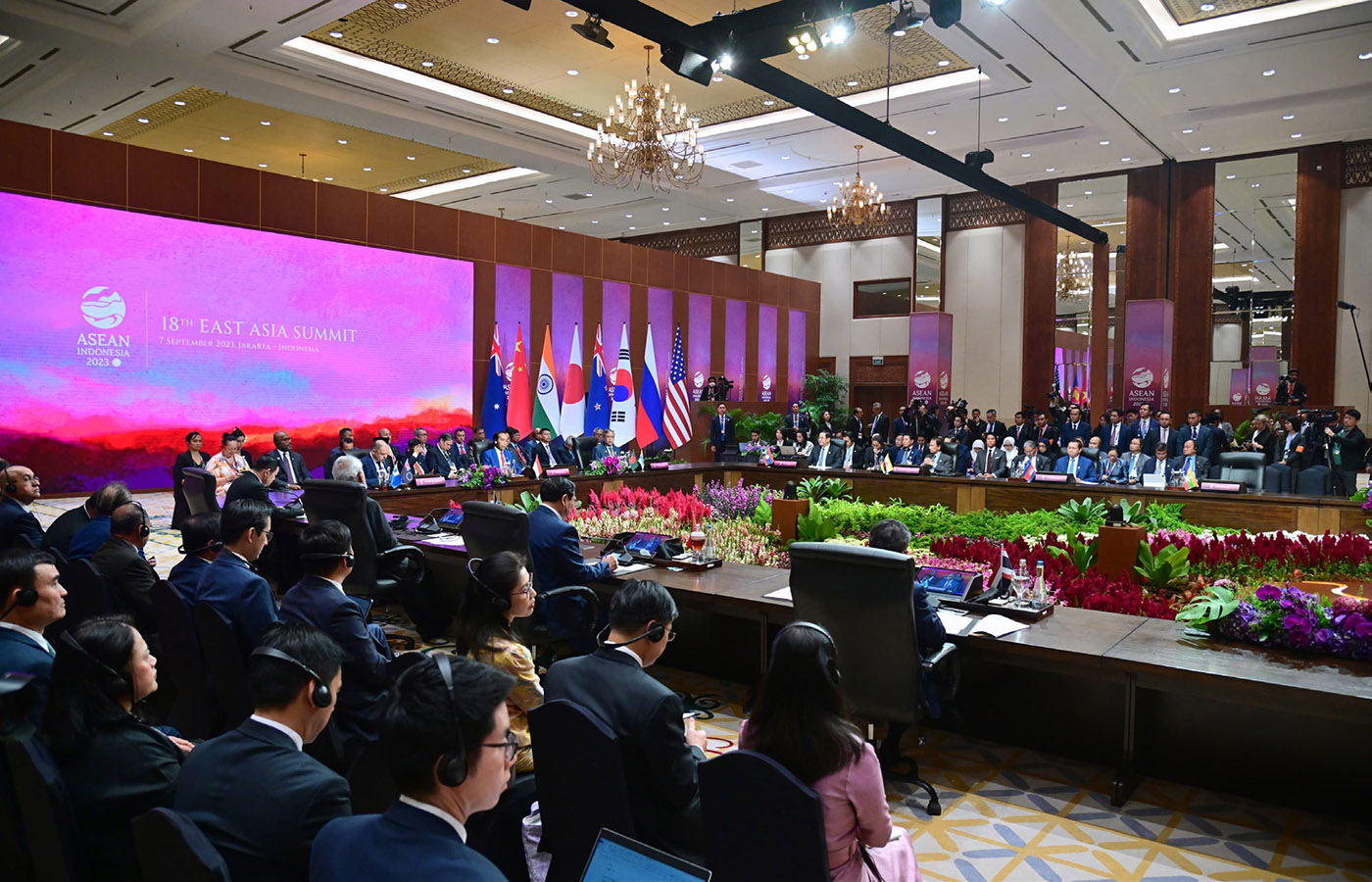 Leaders of ASEAN member countries, alongside Australia, China, India, Japan, New Zealand, South Korea, Russia, and the United States, attending the 18th East Asia Summit, 2023.