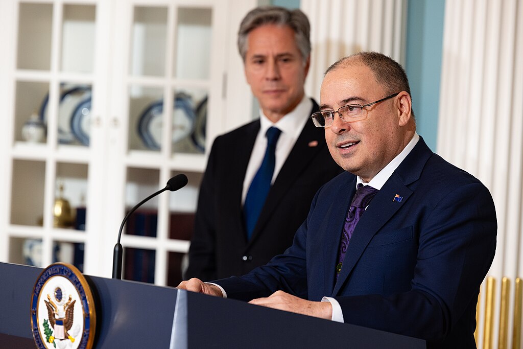 Cooks Islands Prime Minister Mark Brown with US Secretary of State Antony J. Blinken at a joint statement signing ceremony in Washington, D.C., September 2023