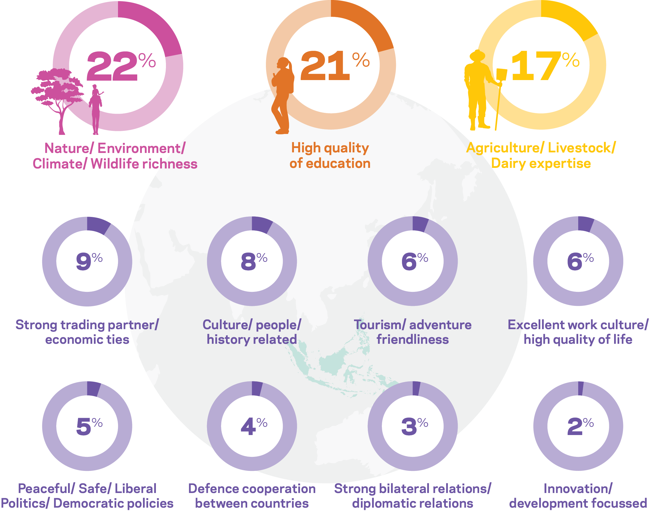 New Zealand’s expertise in agriculture, livestock and dairy was third most frequently mentioned (17 percent), named by almost a quarter of both Singaporean and Malaysian respondents.