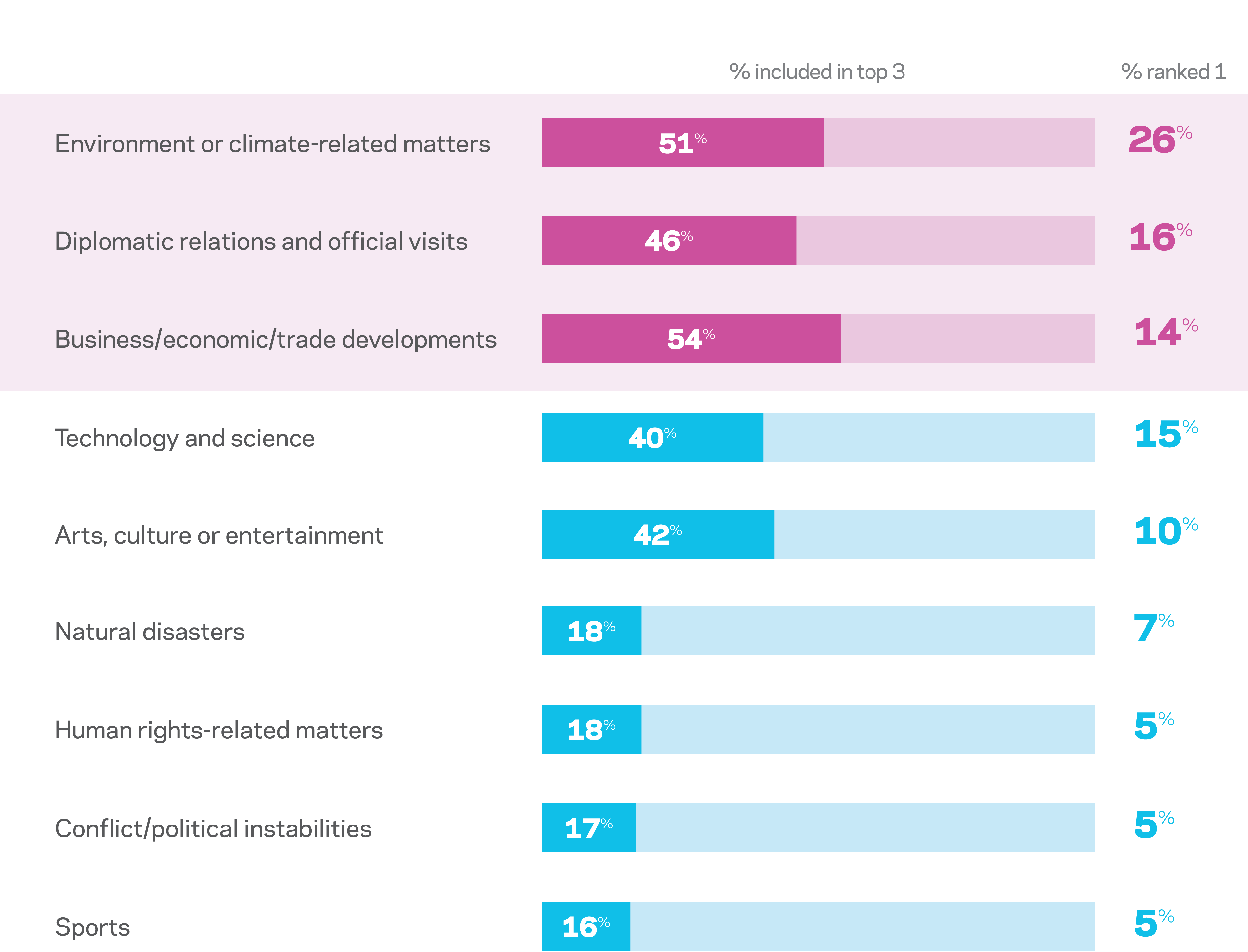 When asked to rank the top three themes that draw the most coverage of New Zealand in local media, respondents most frequently named business/economic and trade developments, followed closely by environmental and climate-related matters, and diplomatic relations and official visits (although less so by Singaporean respondents) as their top three. Climate stories were most frequently ranked in first place by over a quarter of respondents.