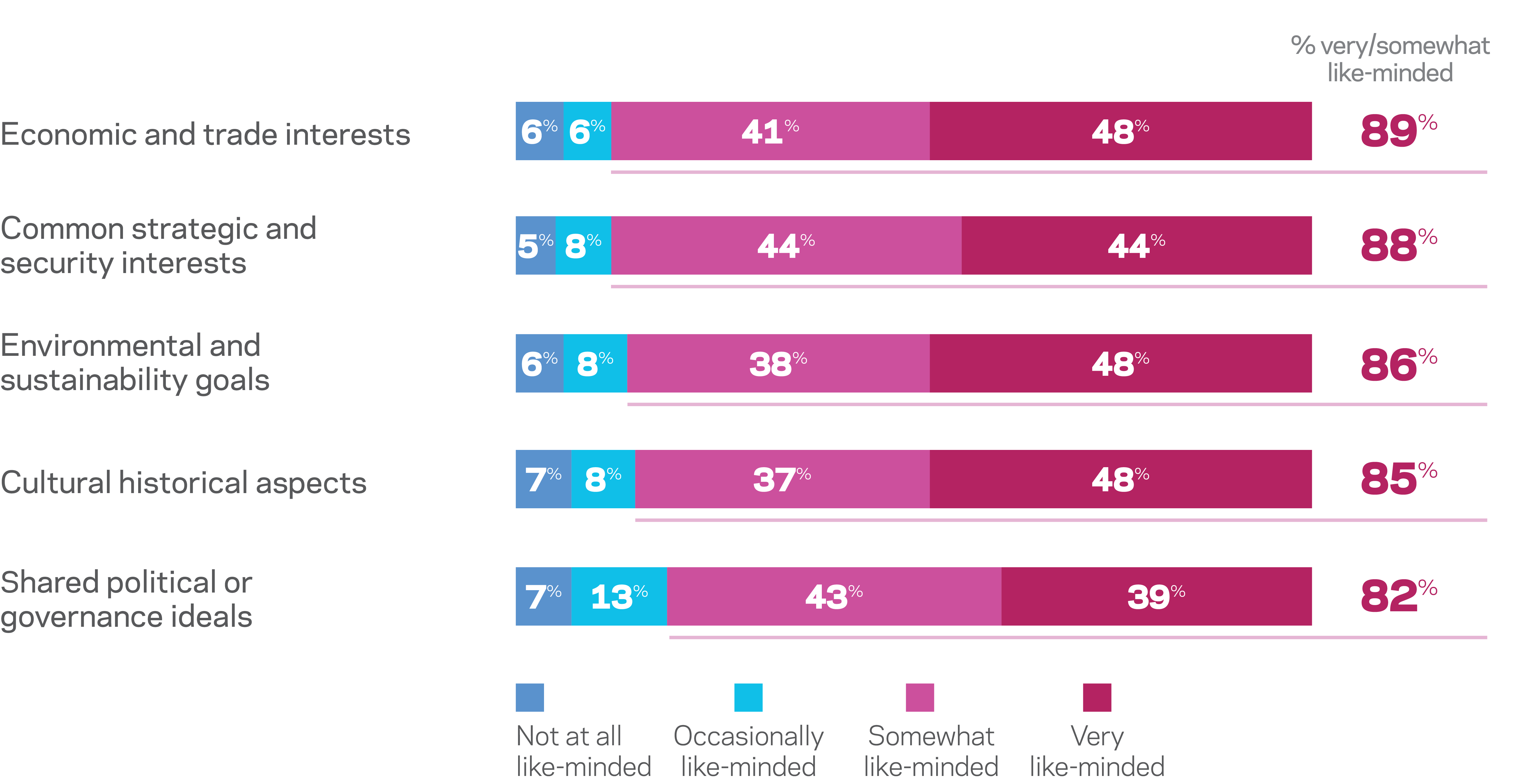 Economic and trade interests were seen as the most aligned, followed closely by strategic security interests. New Zealand is seen as least like-minded on political and governance ideals.