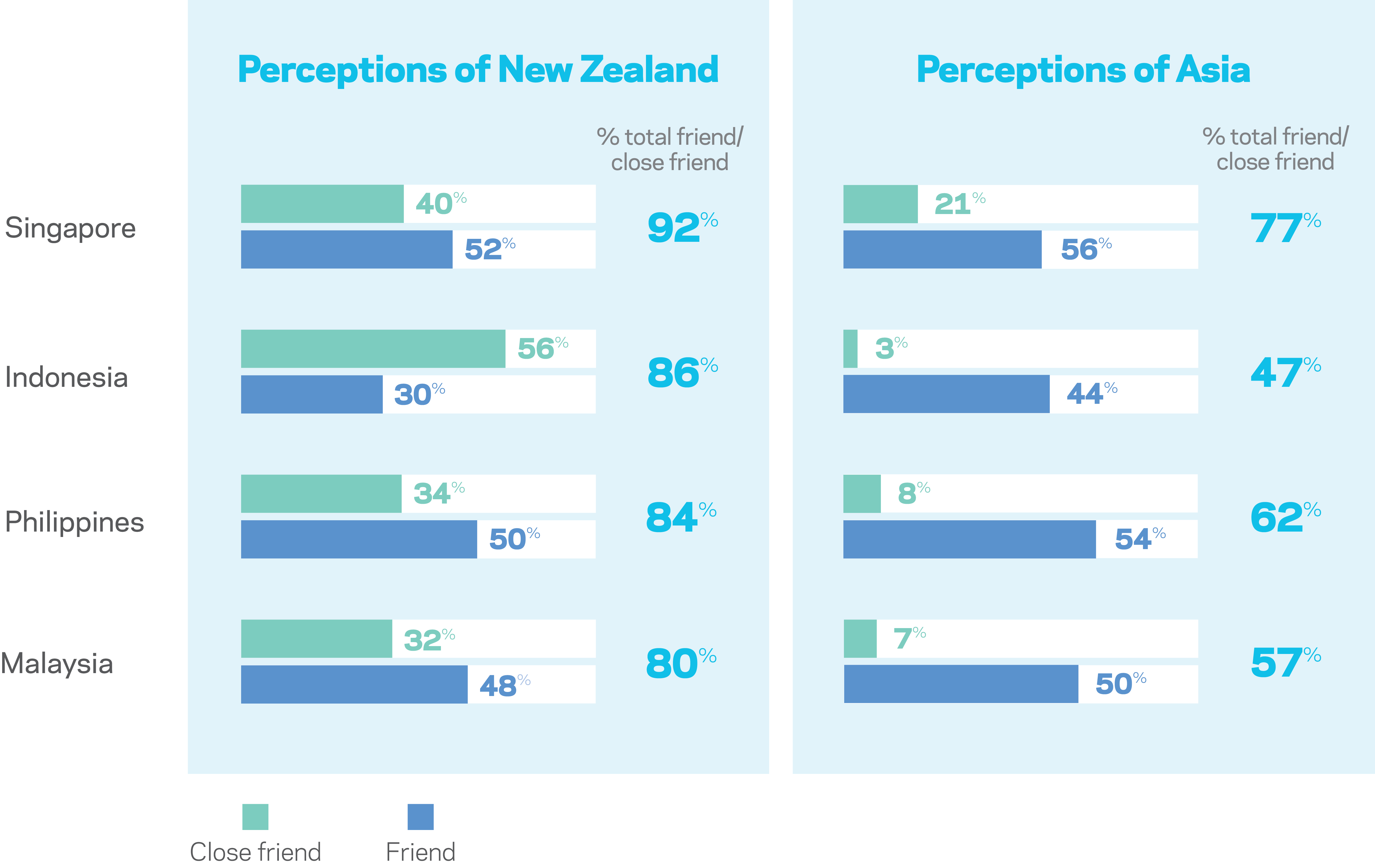 Singaporean respondents have the warmest perceptions of New Zealand, with 92 percent naming it a friend or close friend. The finding aligns with New Zealanders’ perceptions of Singapore as New Zealand’s closest friend in Southeast Asia, and closest friend in Asia after Japan.