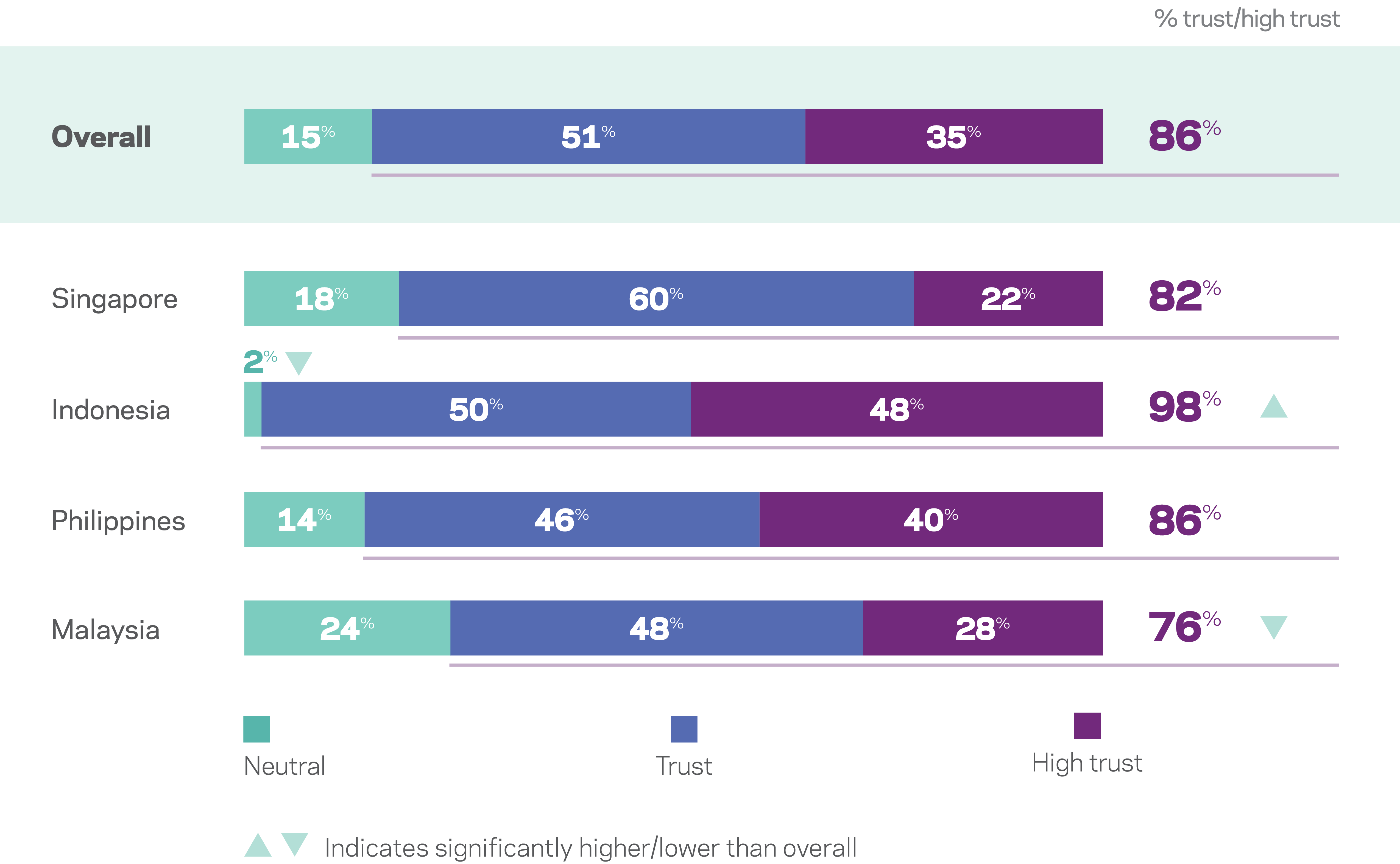 Overall, 86 percent of respondents express high or very high trust in New Zealand to act responsibly in the world. Trust is highest among Indonesian respondents and lowest among Malaysian respondents, with almost a quarter of the latter saying they have “neutral” trust in New Zealand.