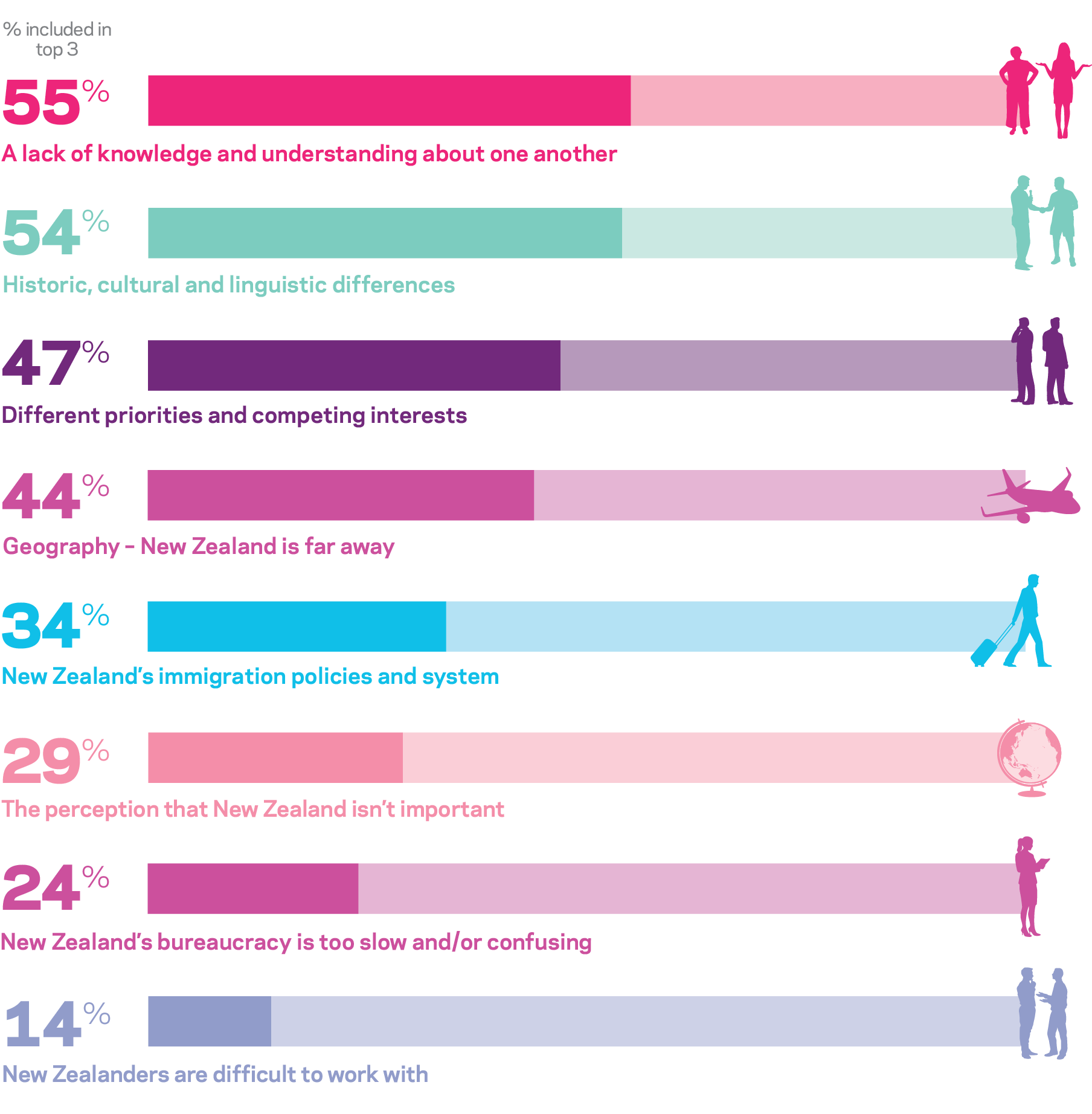 Q: Please rank the top three barriers to stronger relations between New Zealand and [respondent's country of residence].