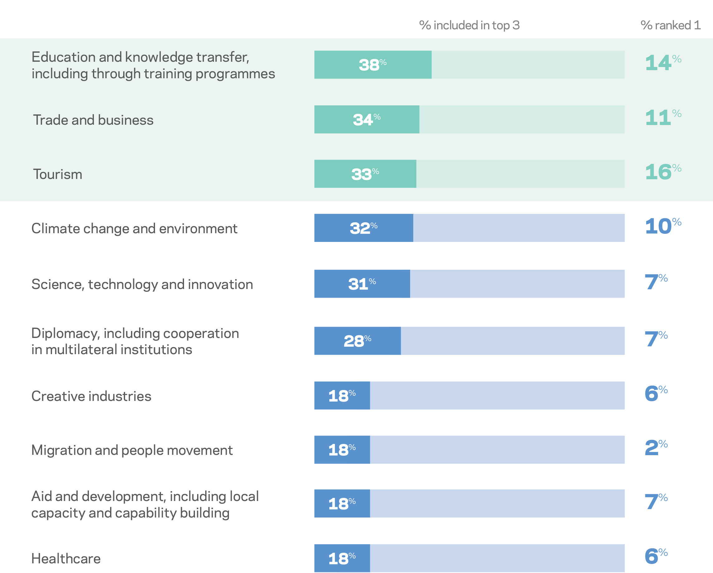 Energy was an area frequently ranked highly by Indonesian respondents, likely reflecting cooperation on accelerating Indonesia’s geothermal energy development.
