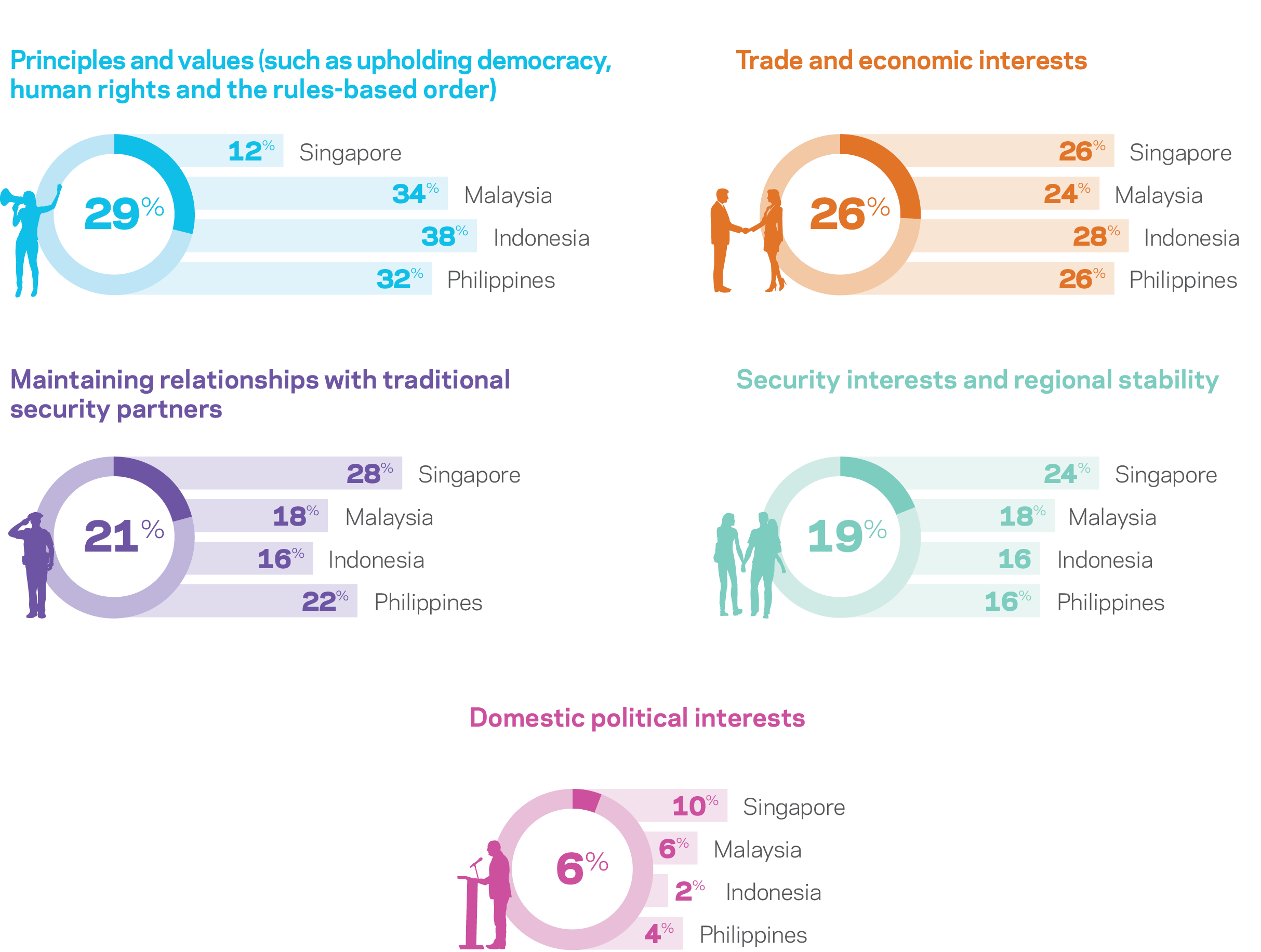 Increased diplomatic ties, including cooperation in multilateral institutions, rounded out the top three for Indonesia and the Philippines, while Malaysian respondents want to see more tourism ties.