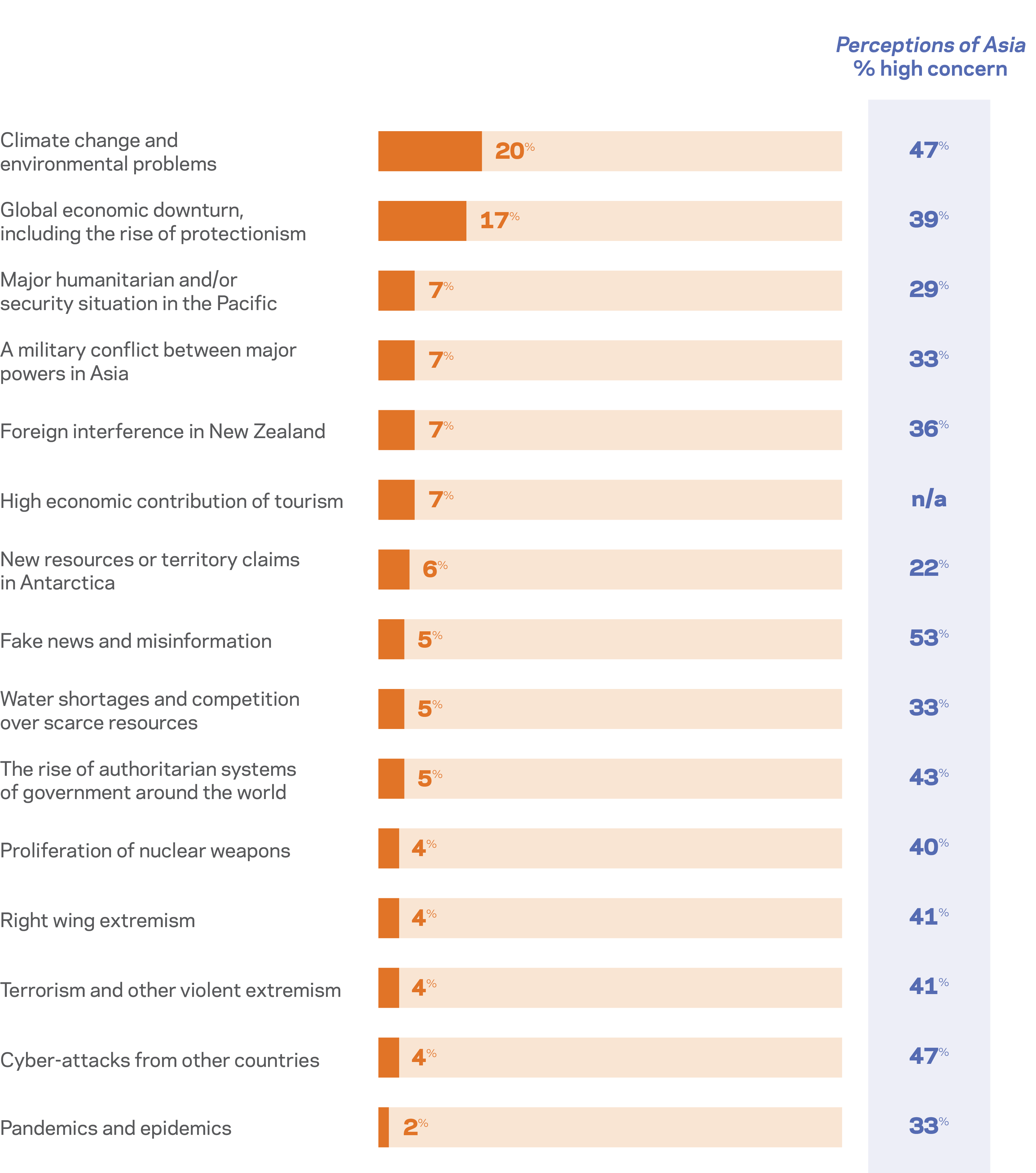 Interestingly and in a key point of difference to the latest Perceptions of Asia survey, only five percent think fake news and misinformation is the issue New Zealand should be most worried about. Fake news topped the list of New Zealanders’ perceptions of the biggest threats to New Zealand’s vital interests.