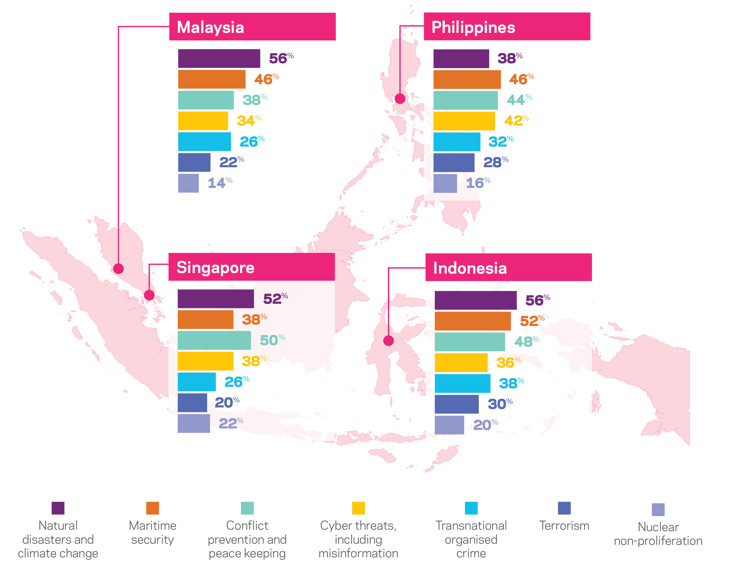 Natural disasters and climate change were identified as the most important security and defence issues on which to cooperate by over half of all respondents in Malaysia (56 percent), Singapore (52 percent) and Indonesia (56 percent).