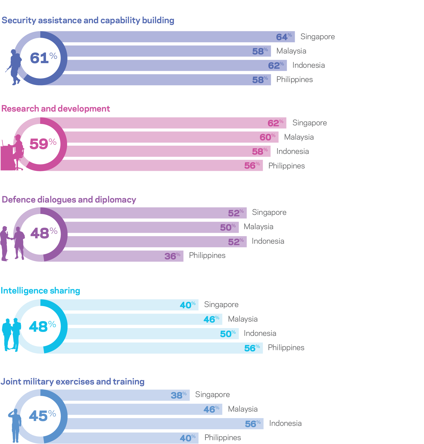Filipino respondents (46 percent) rated maritime security as the most important area for defence cooperation, most likely due to ongoing territorial disputes between the Philippines and China in the South China Sea. Over half of Indonesian respondents (52 percent) also named maritime security in their top three areas for cooperation.