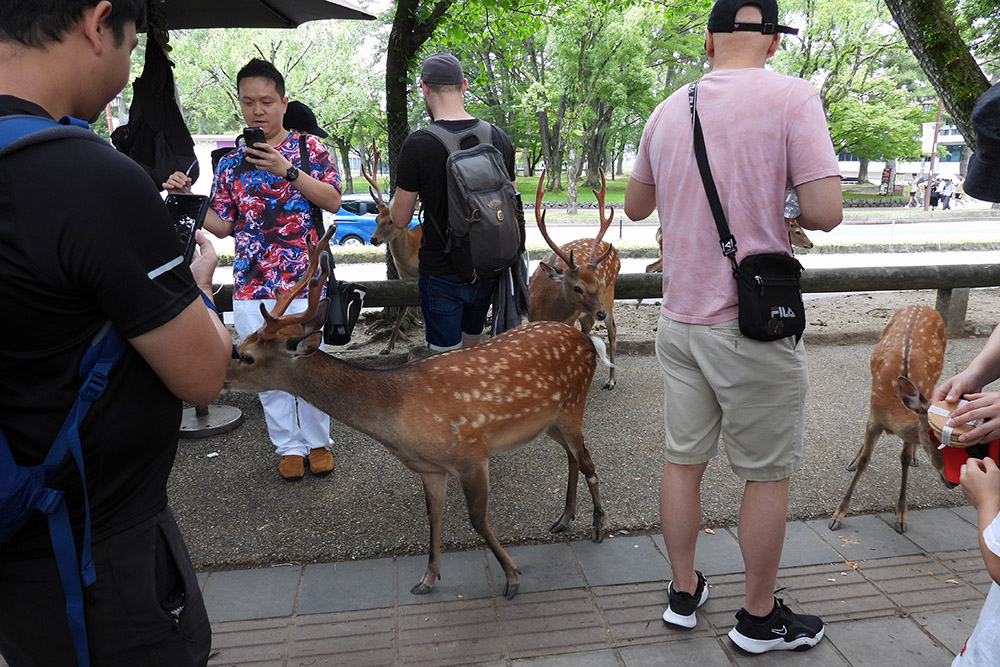In Nara, team members fed the deer with special deer waffles bought from a vendor